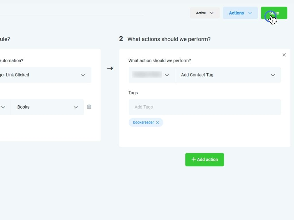 We have created a tag "booksreader" for this example. Whenever someone clicks on the Books link embedded in the campaign email, this trigger will fire and will give the contact a “booksreader” tag.