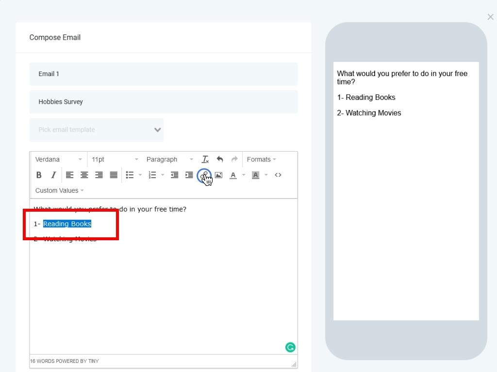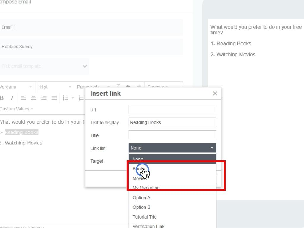 We’re going to do the same thing for our second option, Watching Movies. We’ll select the text and click on the link icon in the tools.