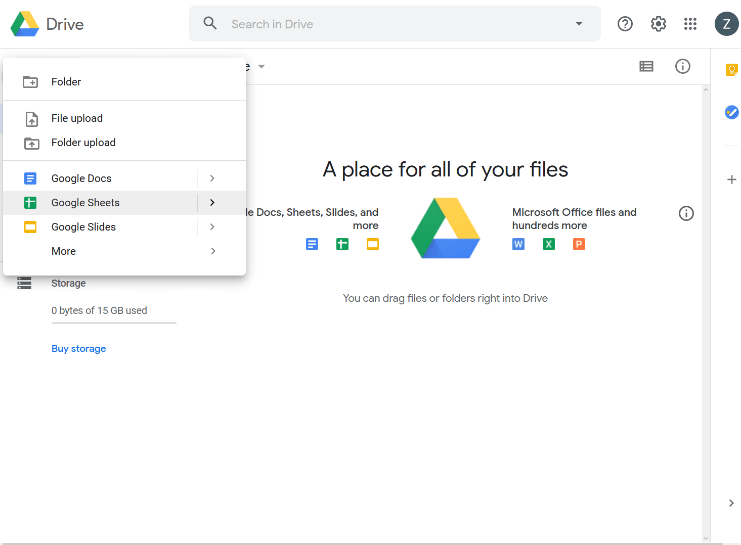 This takes us to our Google Drive homepage where we'll create a Google Sheet to store our data. Click “New” at the top left, and then select “Google Sheets”.