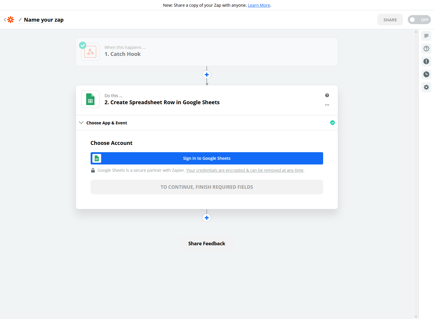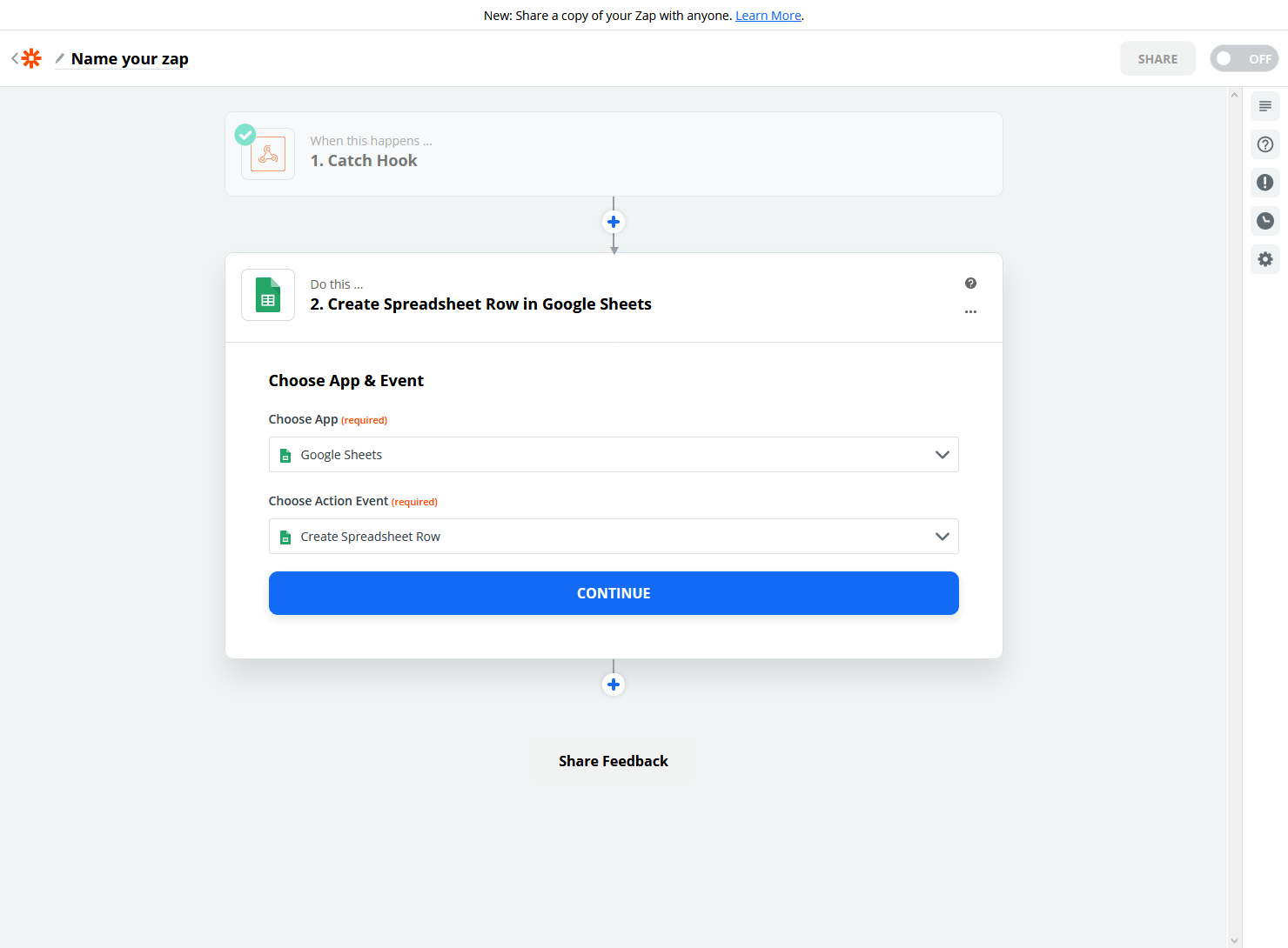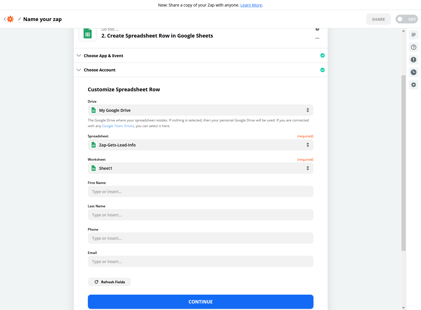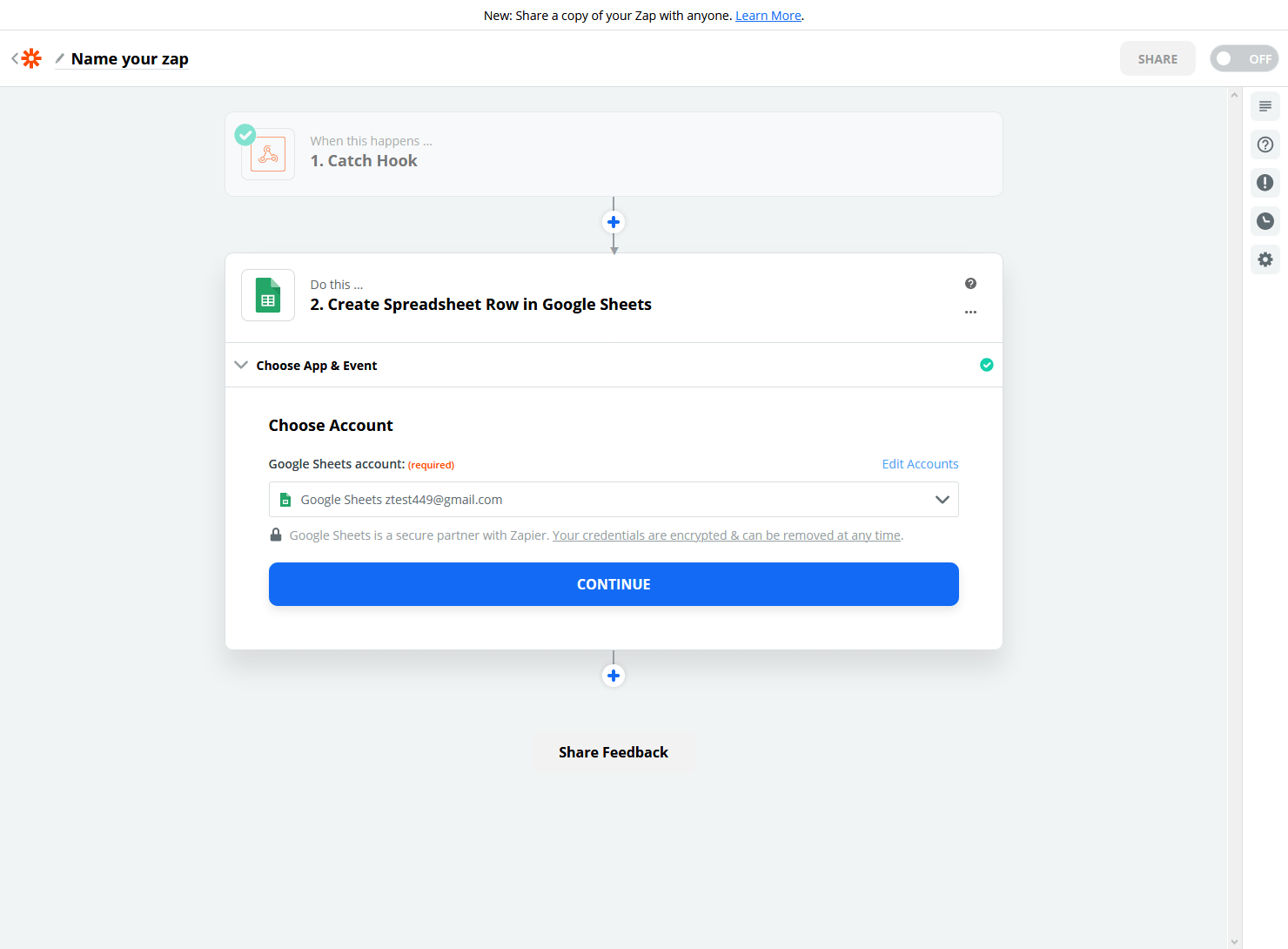 You can see that Zapier has already discovered our Google account and all we need to do is click “Continue as Zap”.