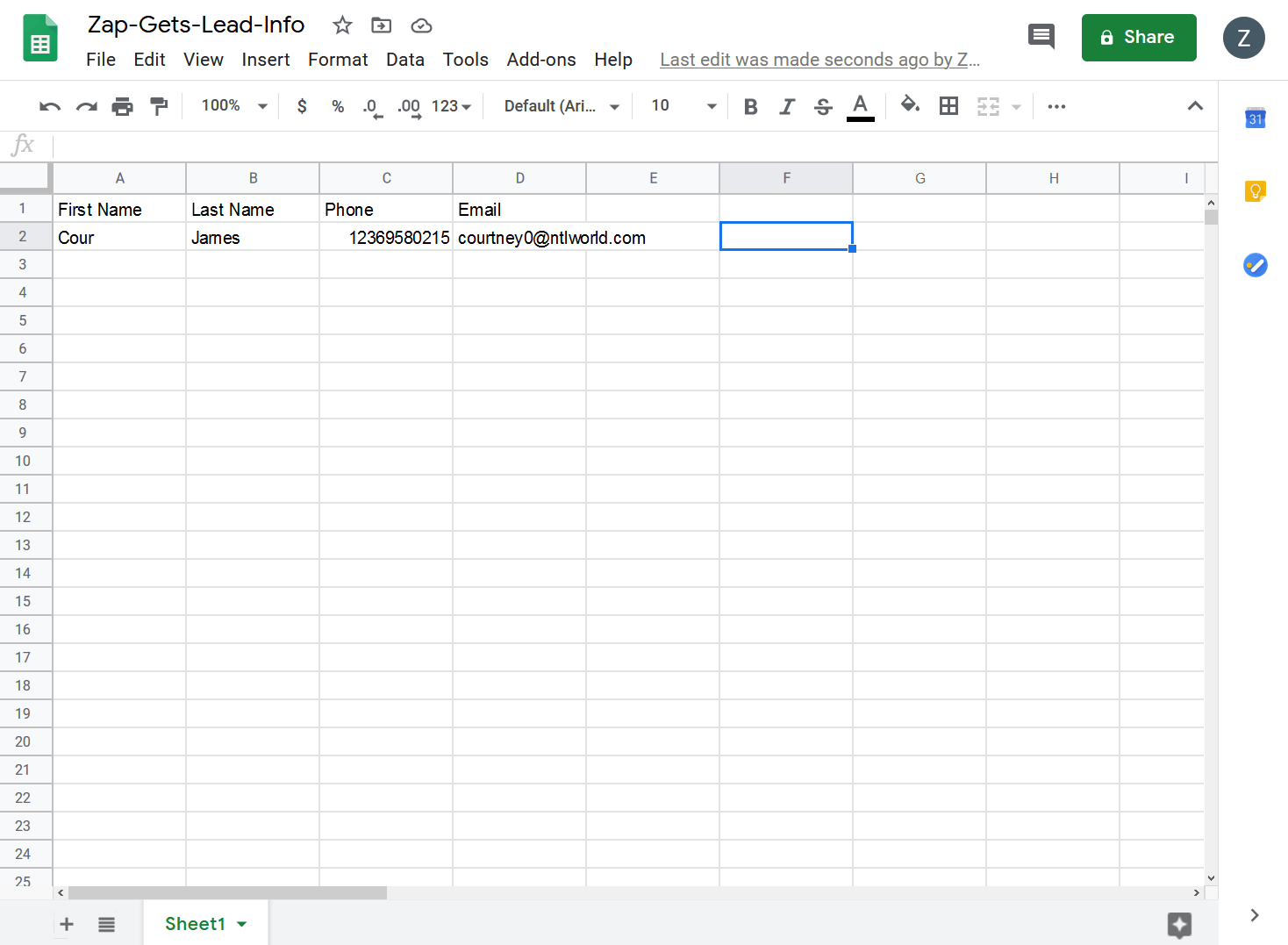 Great! The same dummy data that we entered on our form has appeared in our Google Sheet, which means that we've configured everything correctly.