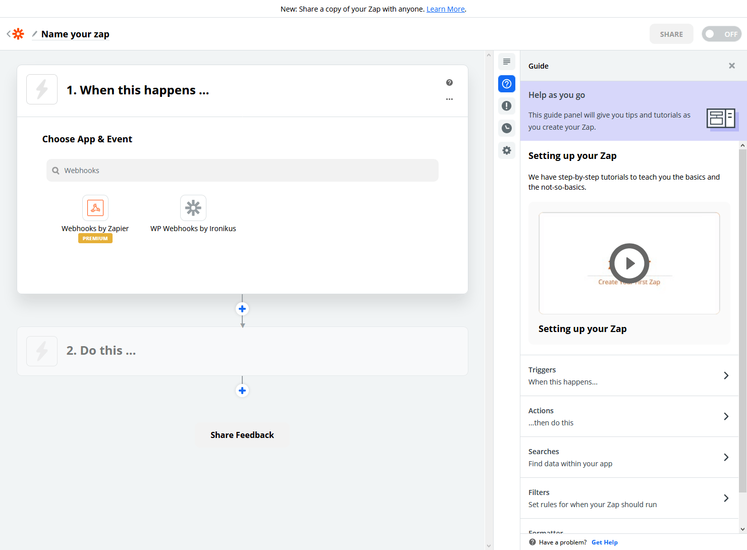 Let's click the black "Make a Zap" button at the top left of the screen.