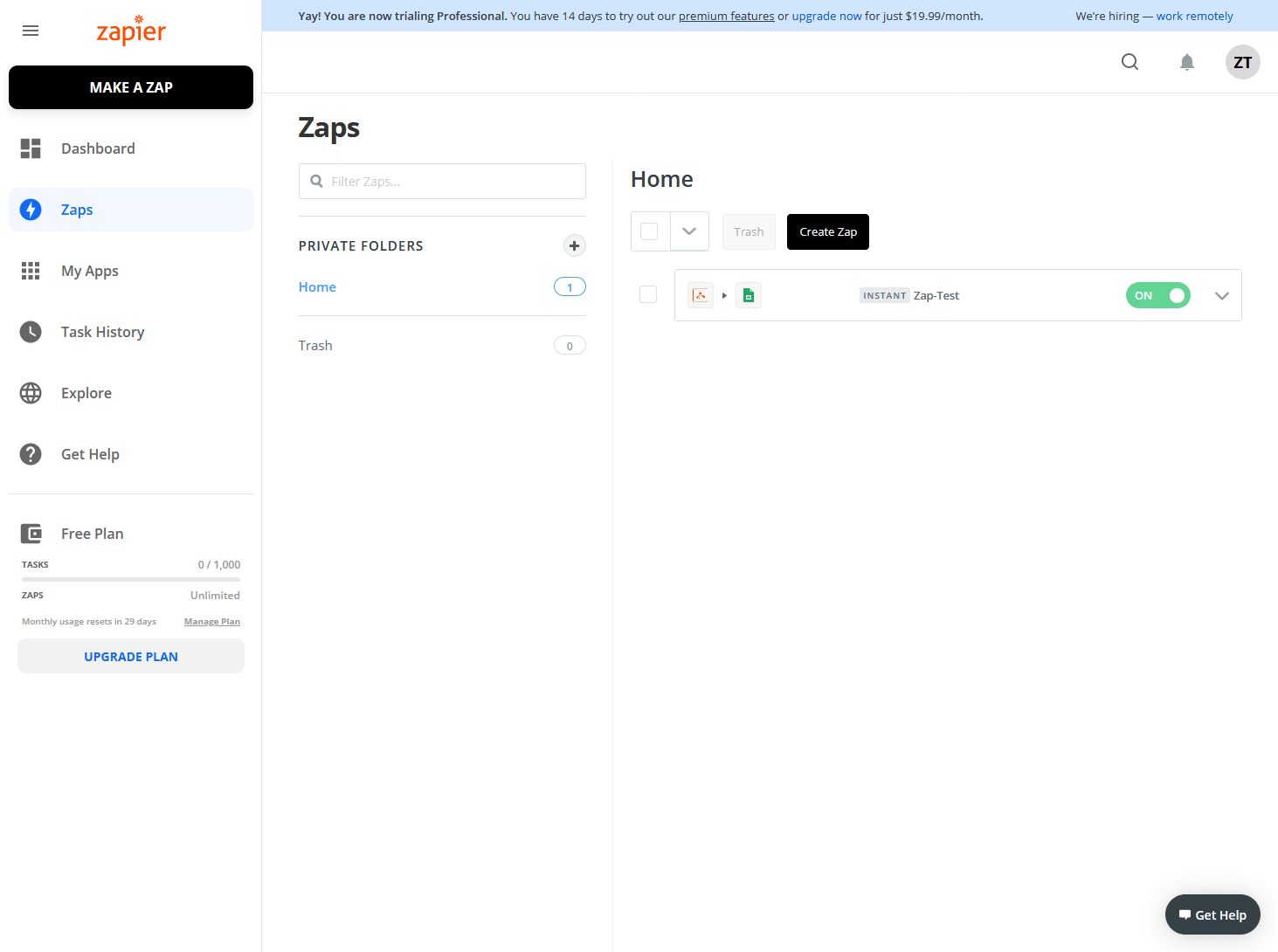 Now when we click the “Go To My Zaps” button, we can see our Zap test listed there.