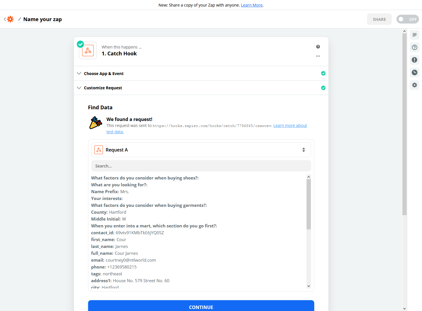 As we can see, Zapier has successfully imported the data. Click “Continue”.