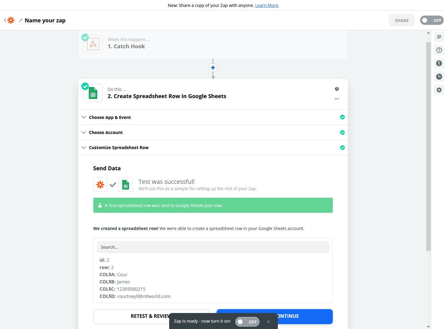 A message will appear telling us that a test row was sent to our spreadsheet.